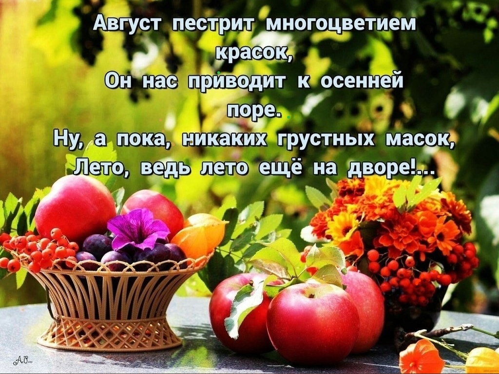На тёмной дорожке прохожий. Спешит. Это август идёт. Сейчас позвонит в дверь. Ну, что же? Для встречи сварила компот. Меда принесёт и орехи, Да яблок с румянцем зари. Замечу в одежде прорехи - Он листьями станет сорить. Лучистые астры подарит И чёрных очей звездопад И старый знакомый сценарий, Где есть золотящийся сад. Промокший большими дождями, Сложивший до неба костры, Придёт с лаконичными днями, Пока мой компот не остыл.