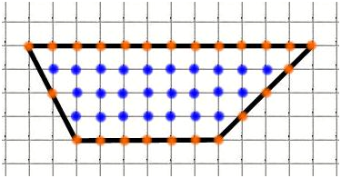 Формула Пика S=В+Г/2-1.Где В-это количество внутренних углов,Г-это количество граничащихся углов.Эту формулу можно применять для решения 19 задания на ОГЭ.Дети очень легко находят площадь с помощью этой формулы.Учащимся не надо делить фигуру на части и находить по отдельности площади этих частей и складывать.Вместо различных формул достаточно запомнить одну формулу.Для всех фигур