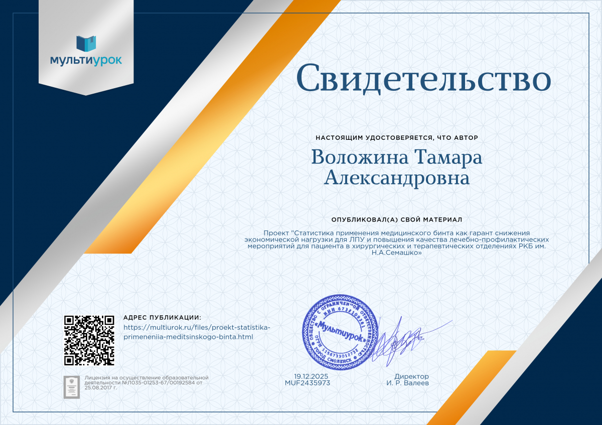 ПРОЕКТ «Статистика применения медицинского бинта как гарант снижения экономической нагрузки для ЛПУ и повышения качества лечебно-профилактических мероприятий для пациента в хирургических и терапевтических отделениях РКБ им. Н.А.Семашко»