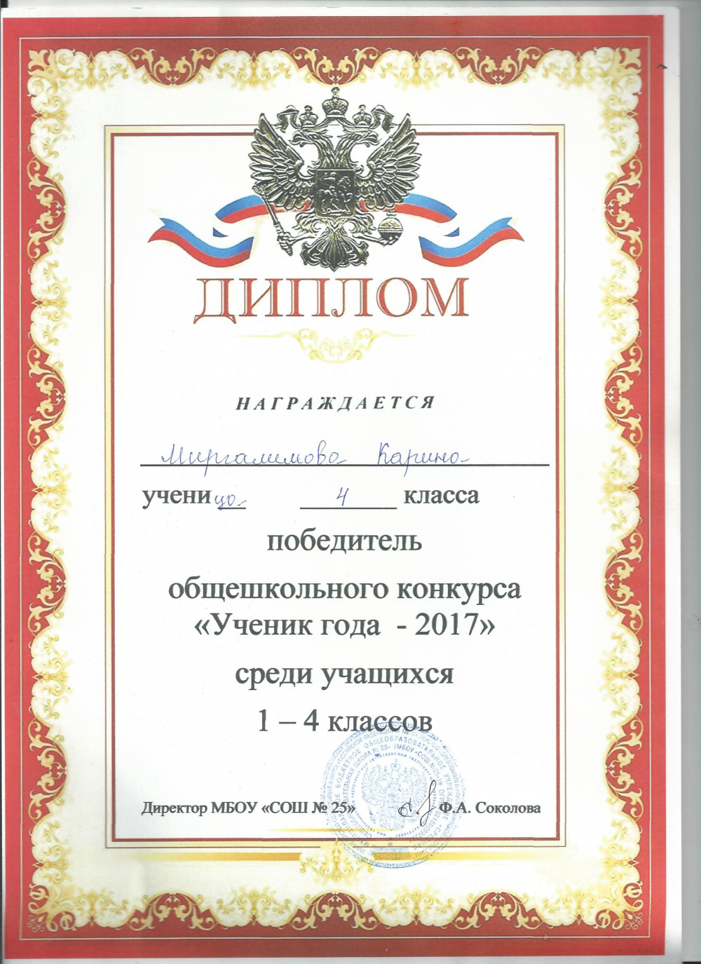 Ежегодно в нашей школе проходит мероприятие "Ученик года" В этом году 4 класс представляла Миргалимова Карина. Среди разнообразия конкурсов было домашнее задание, которое выполнял весь класс. В результате упорной борьбы Карина была признана лучшим учеником среди начальной школы и получила Диплом победителя.