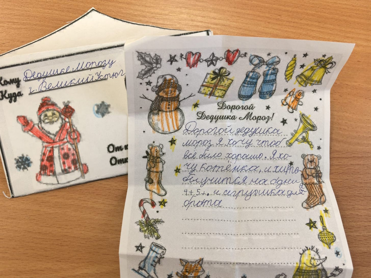 В гости мы пришли не с пустыми руками, дети написали письма с поздравлениями и, конечно же, заветными желаниями.
