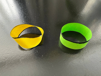 Для конструирования объекта я использовал обычную полоску бумаги. В отличие от простого кольца, при склеивании я перевернул один из краев на 180 градусов (сделал один полуоборот). Таким образом, верхний угол одного конца соединился с нижним углом другого. В результате получилась перекрученная петля, которая и является классической лентой Мёбиуса.