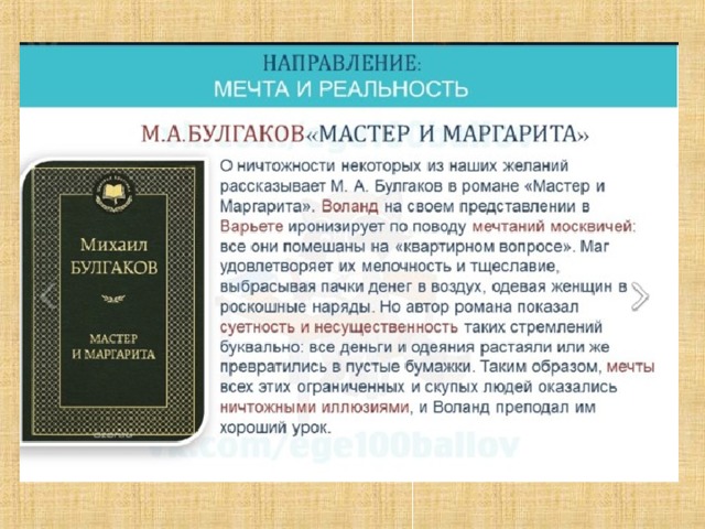 • Героиня романа М. А. Булгакова «Мастер и Маргарита» многое пережила, чтобы воплотить свою заветную мечту. Женщина страстно желала вернуть своего любимого человека, который пропал. Она перепробовала все возможное, но так ничего и не узнала о его судьбе. И вот однажды она встретила незнакомца, который сделал пугающее предложение: взять крем, намазать все тело и ждать его звонка. После этого должна произойти встреча с иностранцем, который знает о Мастере то, что так хочет узнать Маргарита. Женщина очень испугалась, но решилась на этот шаг. Она навек оставила мужа и всю прежнюю жизнь в довольстве и праздности. Ей пришлось познакомиться с дьяволом и стать хозяйкой на его балу. Она вытерпела и боль, и страх ради любви. В результате героиня смогла вызволить Мастера, но исполнение мечты досталось ей дорогой ценой. Таким образом, чтобы получить желаемое, необходимо приложить усилия, ведь просто так грёзы не сбываются.
