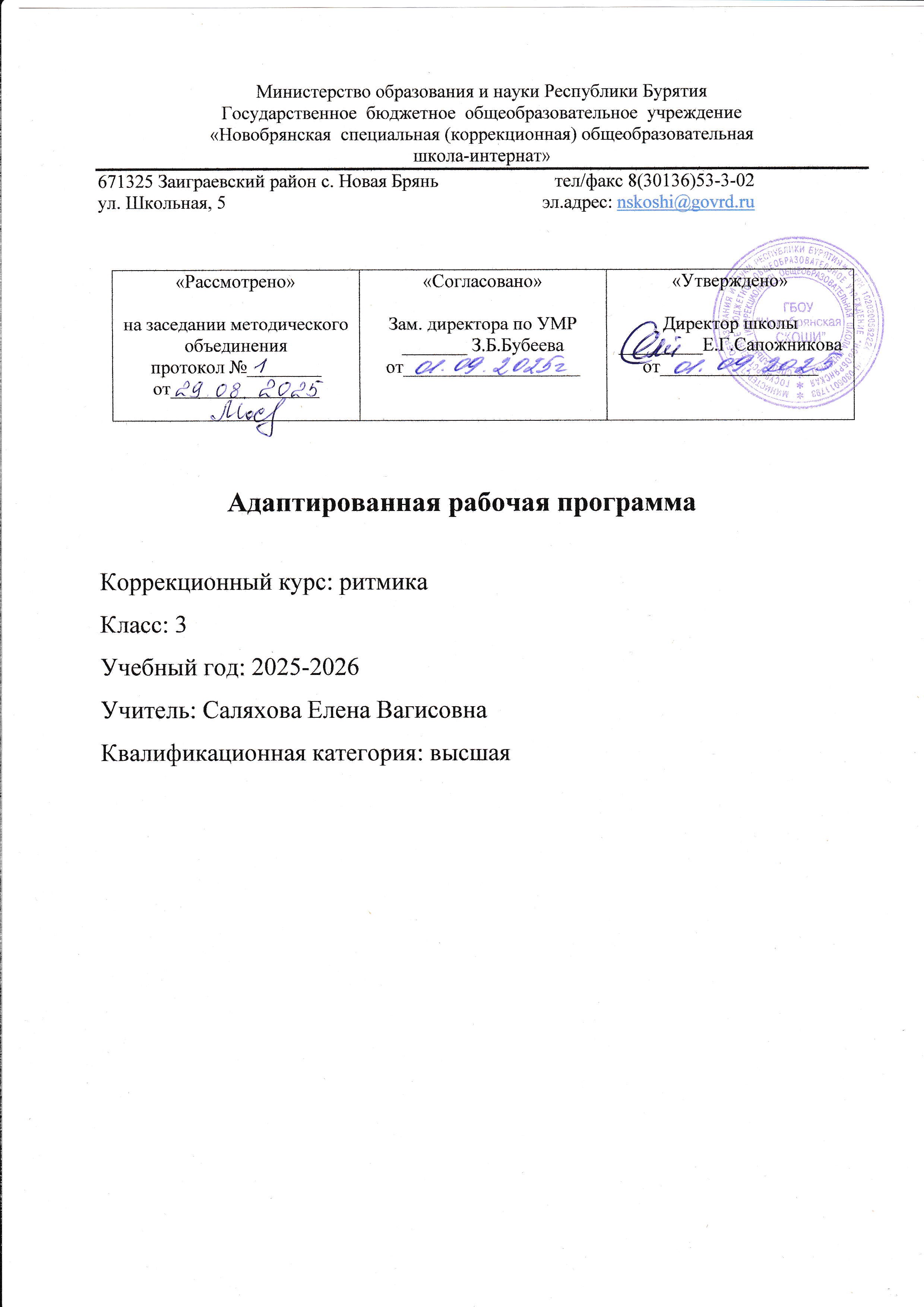 Адаптированная рабочая программа по коррекционному курсу «Ритмика» разработана на основе Адаптированной основной общеобразовательной программы образования обучающихся с нарушением интеллекта ГБОУ «Новобрянской СКОШИ» на 2025-2026 учебный год и следующих нормативно - правовых документов: