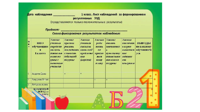 Задачи: провести наблюдение за динамикой работы школьников на уроке; осознанно ли выполнение установленного в данной деятельности порядка; добровольно ли выполнение правил, установленных коллективом недопущение проступков (уход без разрешения с занятий и т. п.); соблюдаются ли правила поведения при изменении обстановки; выполнение учебных задач, поставленных учителем без помощи и постоянного контроля; умение организовать свою деятельность; умение отстоять свое мнение, не проявляя при этом упрямства; умение соблюдать выработанные привычки самостоятельного поведения в новых условиях деятельности; соблюдение определенного порядка, способствующего успеху в деятельности; планирование своих действий и разумное их чередование; рациональное расходование времени с учетом обстановки; умение вносить в свою деятельность определенную организацию при изменении обстановки.