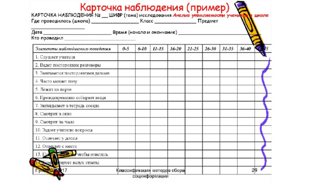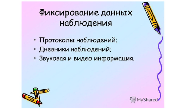 д) определить форму регистрации наблюдаемых объектов (или вид записи) и оценить возможность сопоставления наблюдаемых фактов, полученных в разное время или в разных ситуациях, возможно, разными наблюдателями;
