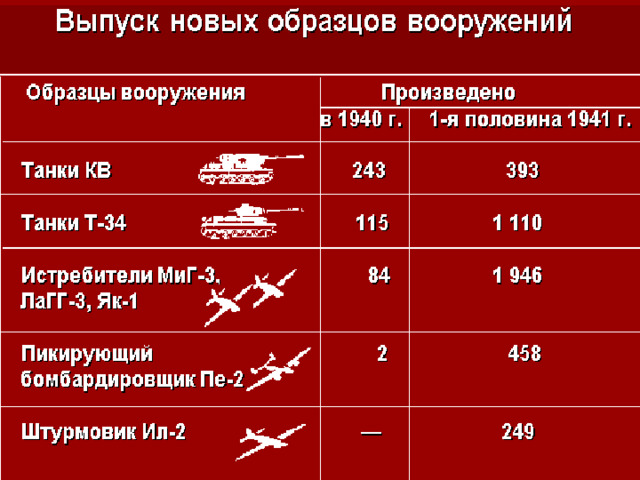 3. Созданы образцы оружия, превосходящие мировые аналоги (истребители Як-1 и МиГ-3; штурмовик Ил-2; бомбардировщик Пе-2; танки Т-34 и КВ; пистолет-пулемёт Г.С. Шпагина и др.)