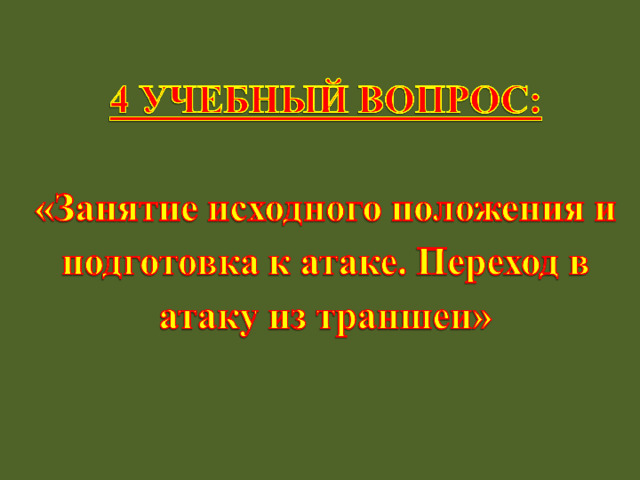 Занятие траншеи для наступления производится по ходам сообщения и другим скрытым подступам и проводится в огра-ниченные сроки с соблюдением мер маскировки, а заканчи-вается незадолго до начала самого наступления. Успех действия солдата в наступлении во многом зависит от того, как он подготовится к атаке.