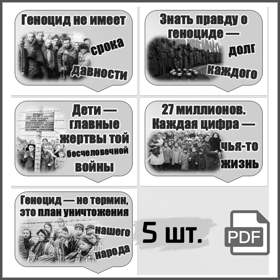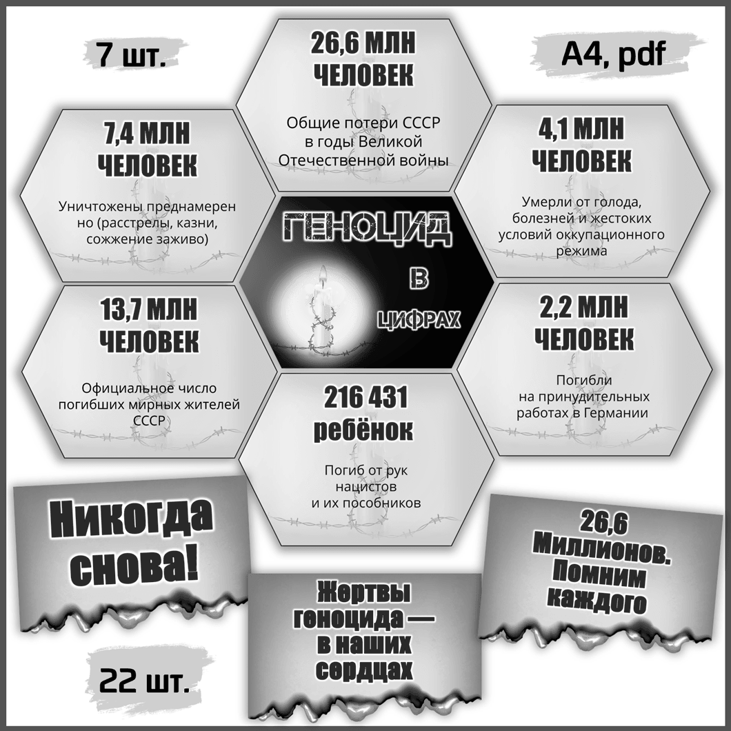 Это готовый набор шаблонов для распечатки на любом принтере и дальнейшего оформления школьной доски, кабинета, залов музея, библиотеки к 19 апреля — Дню единых действий в память о геноциде советского народа в годы ВОВ.Универсальная печать: цветная и чёрно-белая на листах формата А4. Ниже приведены образцы монохромные и в цвете.