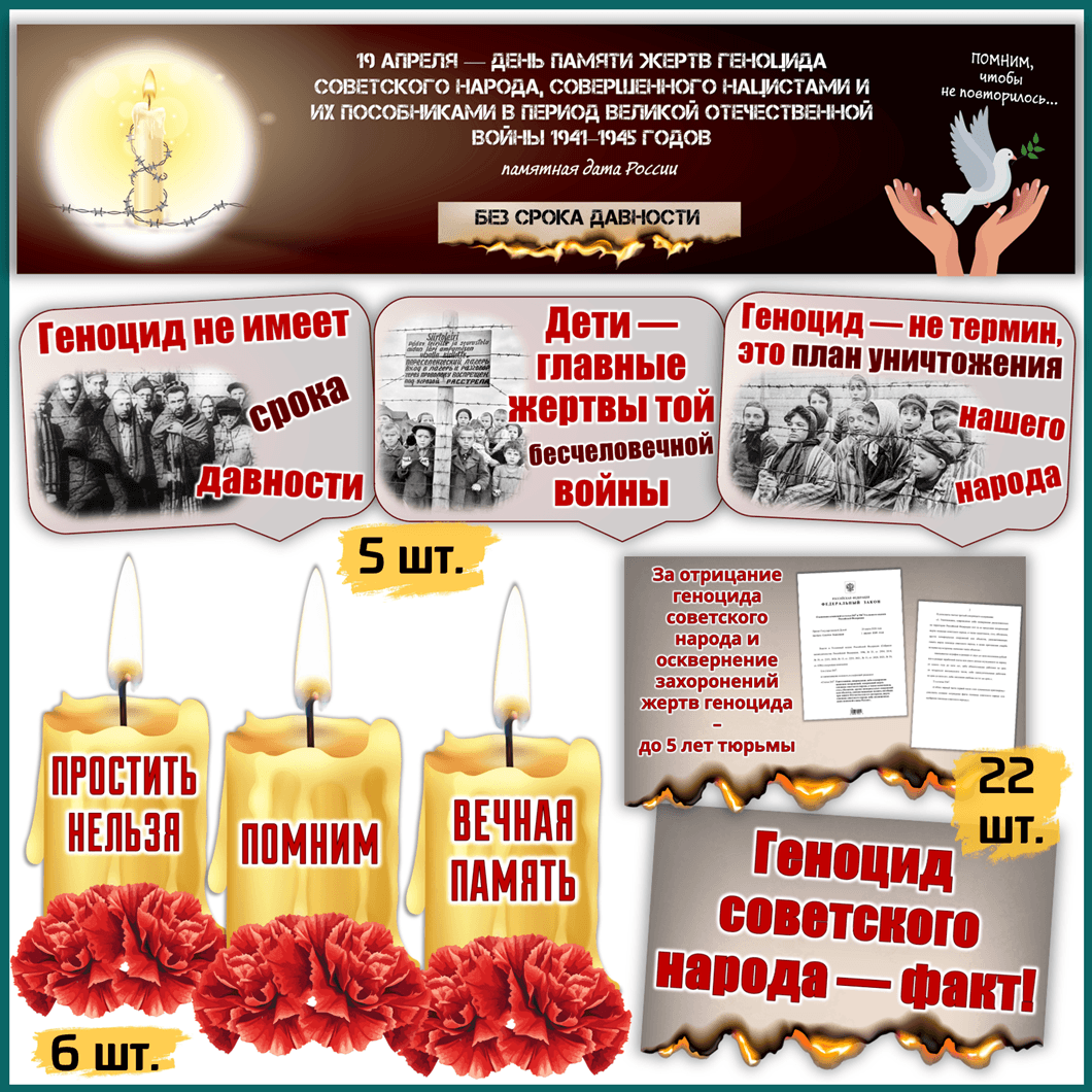 Это готовый набор шаблонов для распечатки на любом принтере и дальнейшего оформления школьной доски, кабинета, залов музея, библиотеки к 19 апреля — Дню единых действий в память о геноциде советского народа в годы ВОВ.Универсальная печать: цветная и чёрно-белая на листах формата А4. Ниже приведены образцы в цвете и монохромные.