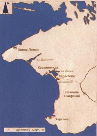 роезжая по трассе Евпатория-Симферополь, Вы обязательно обратите внимание на холм, расположенный на западной окраине г. Саки, там, где шоссе поворачивает на север, вдоль берега моря. Его вершину венчает бетонное сооружение, в котором ныне размещается музейная экспозиция. Но мало кто знает, что насыпь холма хранит в себе тайны поселения античного времени, которое сегодня мы называем – Кара-Тобе.