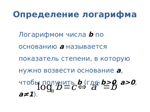 Логарифмом числа b по основанию a называется показатель степени, в которую нужно возвести основание a , чтобы получить b (где b0 , а0 , а≠1 ).