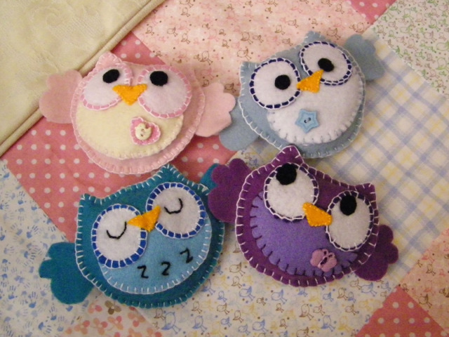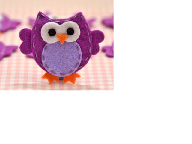 Пришивает сердечко к телу совы обычным швом — вперед иголку.