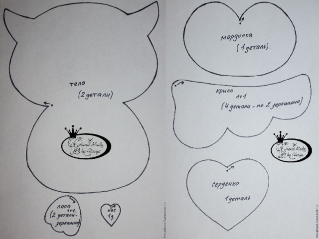 приступаем к сшиванию тела совы, крыльев и лапок. Соединяем две детали тела совы и начинаем сшивать их начиная с точки, указанной на выкройке петельным швом.