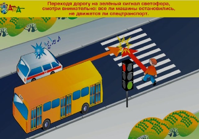 Переходить проезжую часть дороги юный пешеход должен только на разрешающий (зелёный) сигнал светофора, по пешеходному переходу или на перекрёстках!