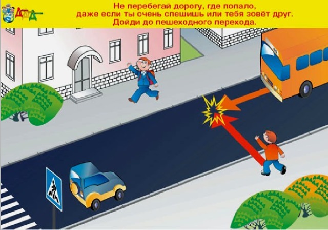 Юный пешеход не должен выходить или выбегать на проезжую часть из-за стоящего транспорта, деревьев, не осмотрев предварительно улицу!