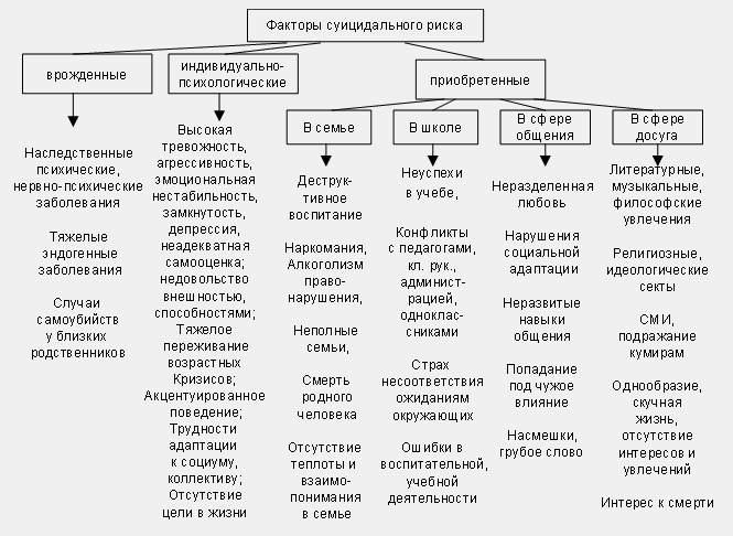 Решаются на такой шаг, как правило, замкнутые, ранимые по характеру, страдающие от одиночества и чувства собственной ненужности, потерявшие смысл жизни подростки. Также причиной суицида может быть алкоголизм и наркомания, как родителей, так и самих подростков, индивидуальные психологические особенности человека, внутриличностный конфликт и т.д. Суицидальные действия у детей часто бывают импульсивными, ситуативными и не планируются заранее. Попытки суицида являются следствием непродуктивной (защитной) адаптации к жизни – фиксированное, негибкое построение человеком или семьей отношений с собой, своими близкими и внешним миром на основе действия механизма отчуждения: попыткам разрешить трудную жизненную ситуацию непригодными, неадекватными способами. Своевременная психологическая помощь, участие, оказанное подросткам в трудной жизненной ситуации, помогли бы избежать трагедий.