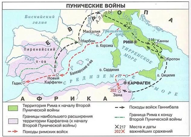 | Вторая | 218-201 гг. до н.э. | Поход Ганнибала через Альпы. Битвы при Каннах (216) и Заме (202). Фабий Максим, Сципион Африканский. | Карфаген разоружён, лишён колоний, платит контрибуцию. |