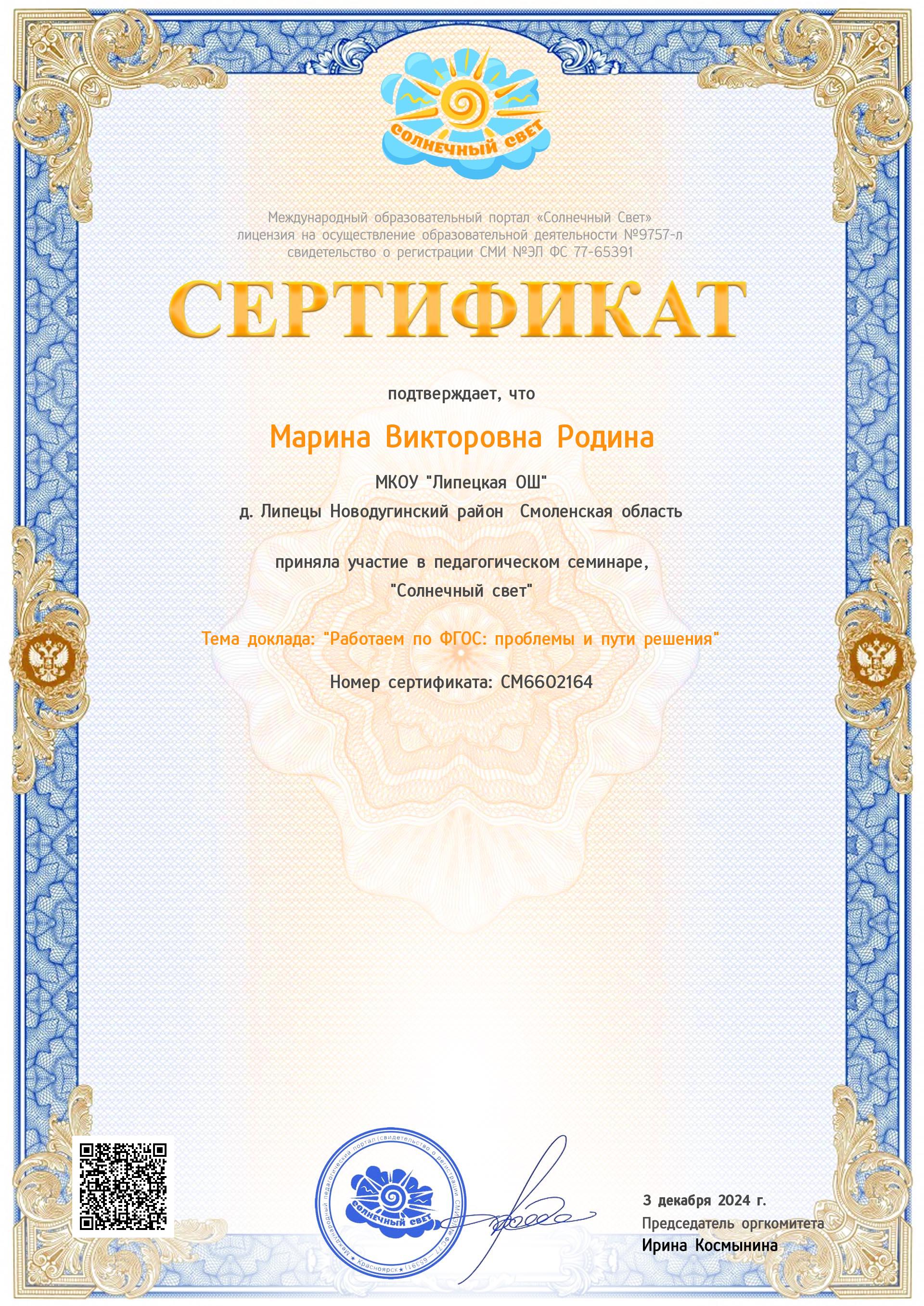 Сертификат участие в семинаре «Работаем по ФГОС: проблемы и пути их решения»