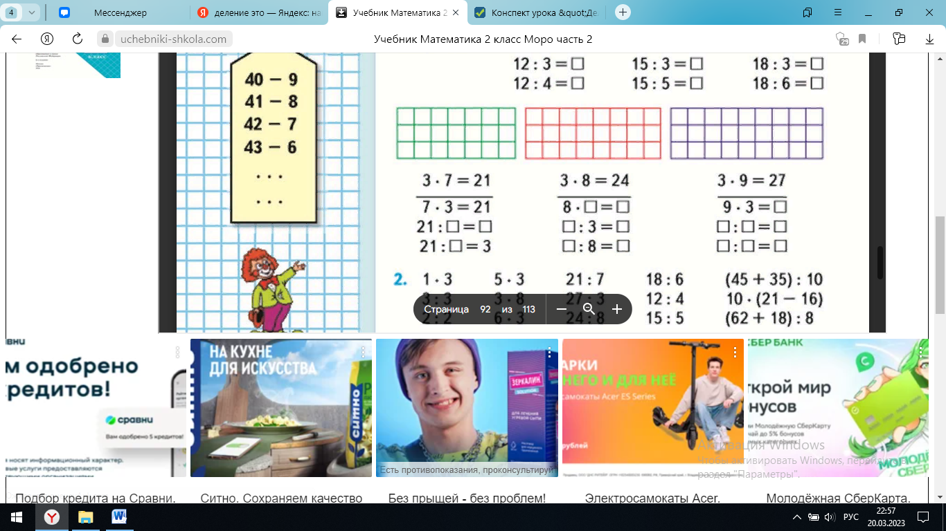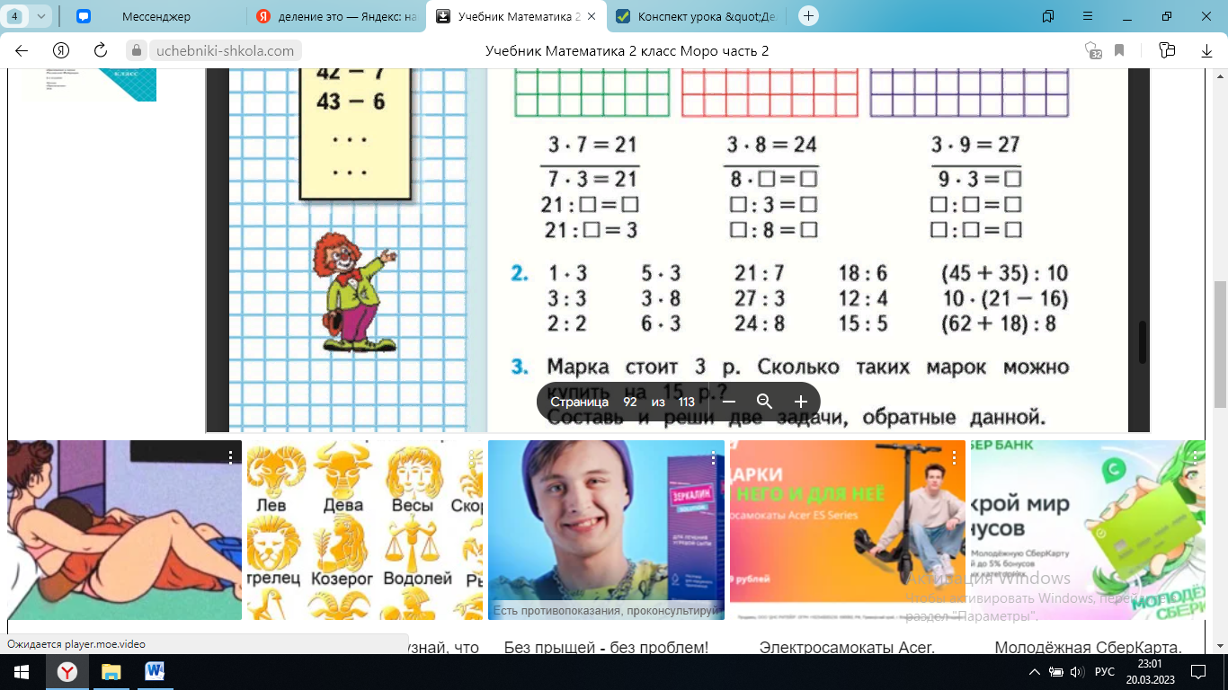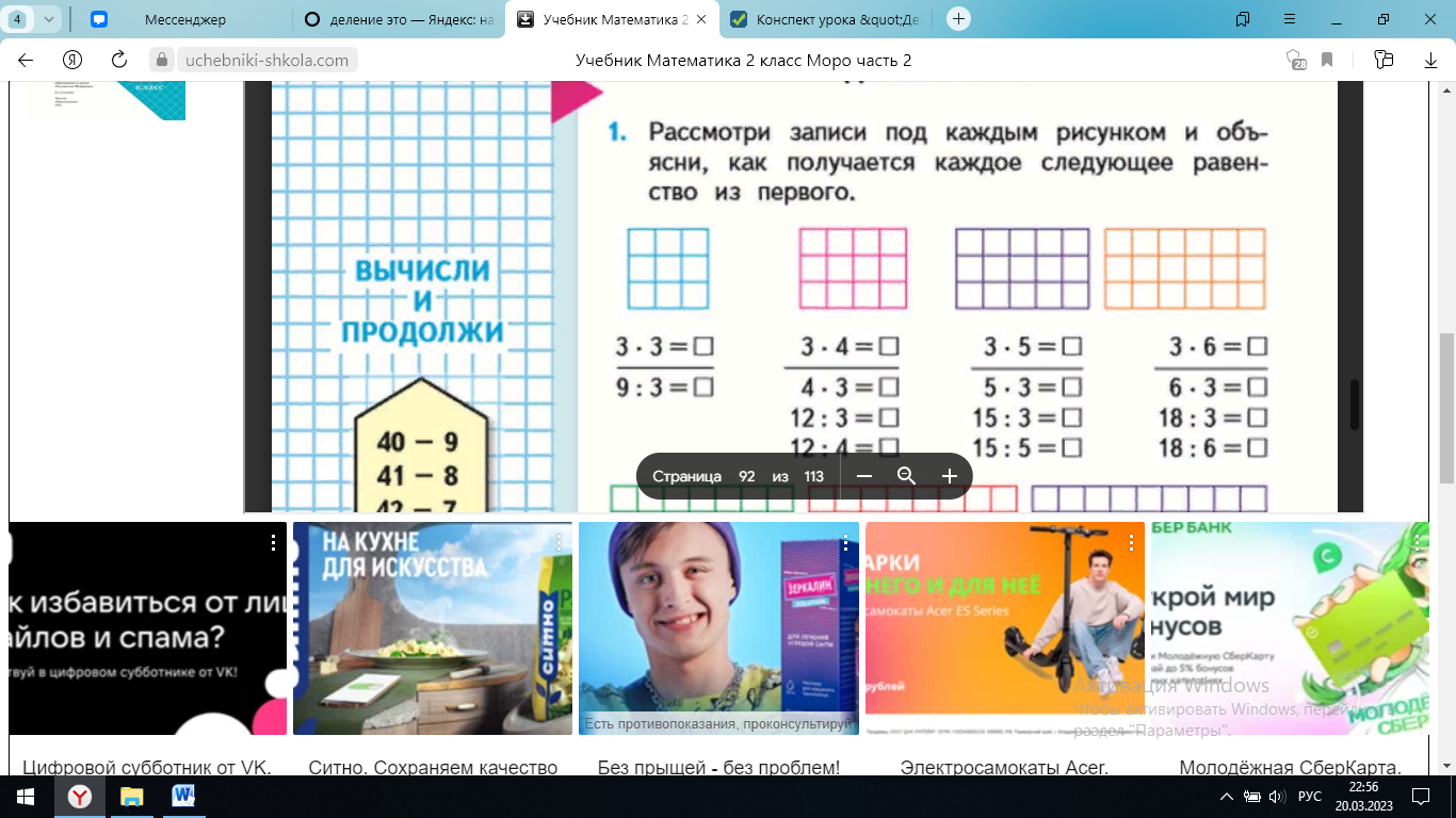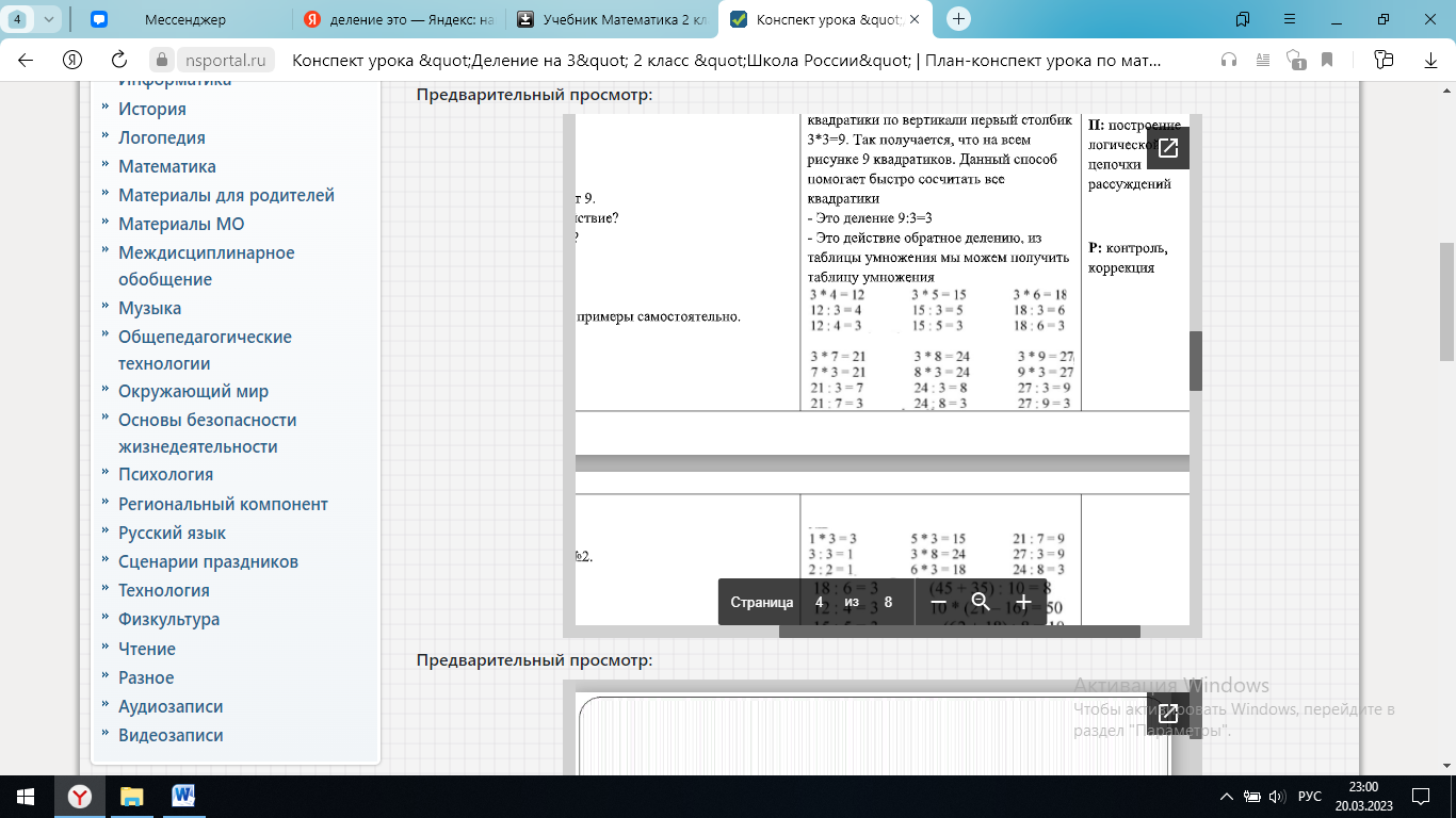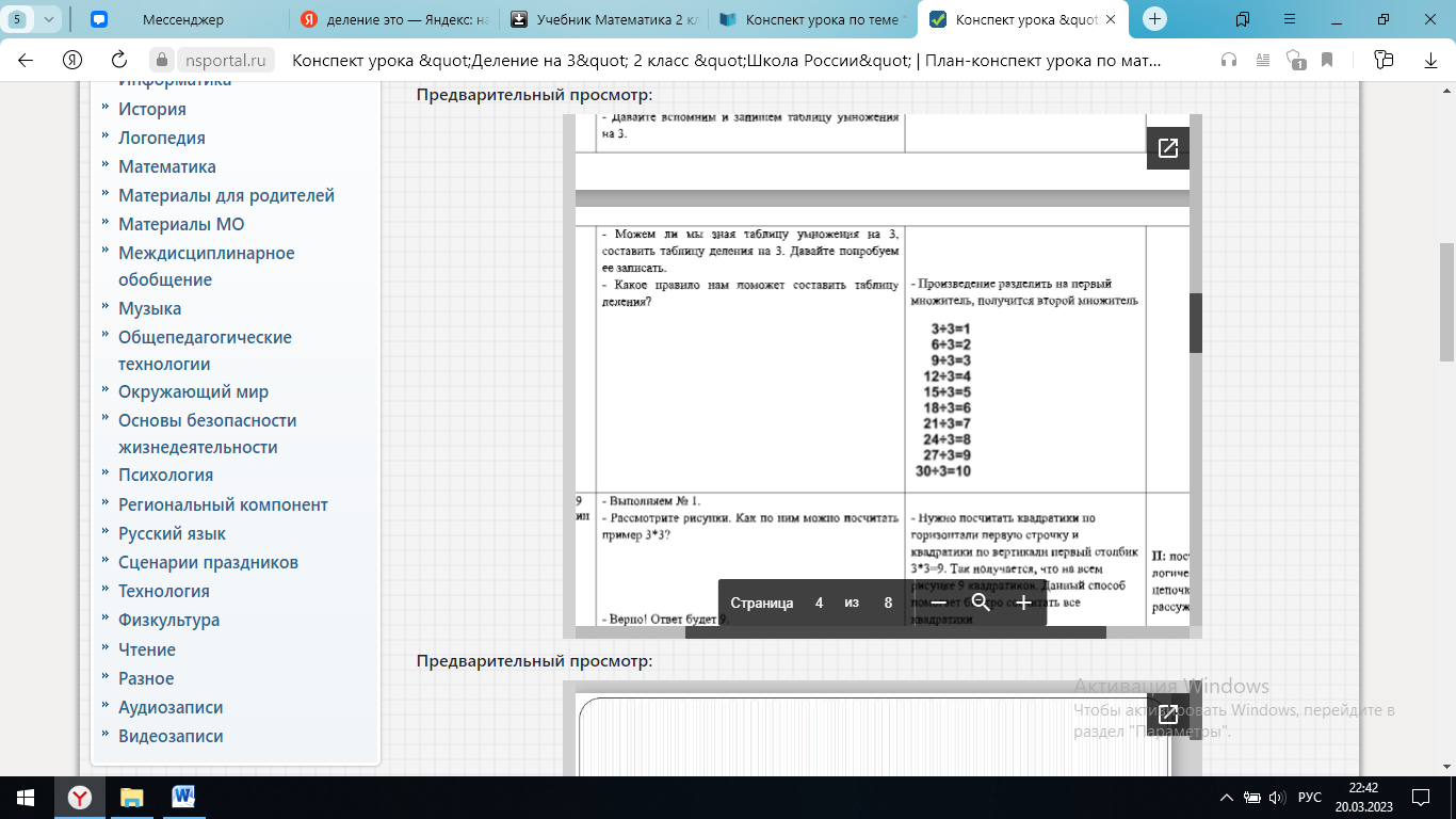 | Практическая деятельность Физкультминутка | - Что такое деление? - Давайте вспомним и запишем таблицу умножения на 3. - Можем ли мы зная таблицу умножения на 3, составить таблицу деления на 3. Давайте попробуем ее записать. - Какое правило нам поможет составить таблицу деления? Верно, записываем в тетрадь самостоятельно напротив таблицы умножения на 3. А затем, проверим вместе. Давайте проверим, (имя), читай, что у тебя получилось. Верно, теперь выполним задание № 1 в учебнике на странице 92 - Рассмотрите рисунки. Как по ним можно посчитать пример 3*3? - Верно! Ответ будет 9. - 9:3 – что это за действие? - Что такое деление? - Решите остальные примеры самостоятельно. - Проверяем. - Устно выполним №2. (Спрашиваю по поднятой руке) Мы с вами уже много пописали, много узнали, настало время и отдохнуть. Встаем из за своих парт, аккуратно, чтобы не мешать друг другу и повторяем за видеороликом. | это математическое действие, обратное умножению. 1*3=3 2*3=6 3*3=9 4*3=12 5*3=15 6*3=18 7*3=21 8*3=24 9*3=27 10*3=30 Произведение разделить на первый множитель, получится второй множитель Выбранный обуч.читает -Нужно посчитать квадратики по горизонтали первую строчку и квадратики по вертикали первый столбик 3*3=9. Так получается, что на всем рисунке 9 квадратиков. Данный способ помогает быстро сосчитать все квадратики - Это деление 9:3=3 - Это действие обратное делению, из таблицы умножения мы можем получить таблицу умножения выполняют упражнение Устно выполняют упражнение из учебника Повторяют движения за видеороликом | Познавательные Регулятивные Предметные Коммуникативные |