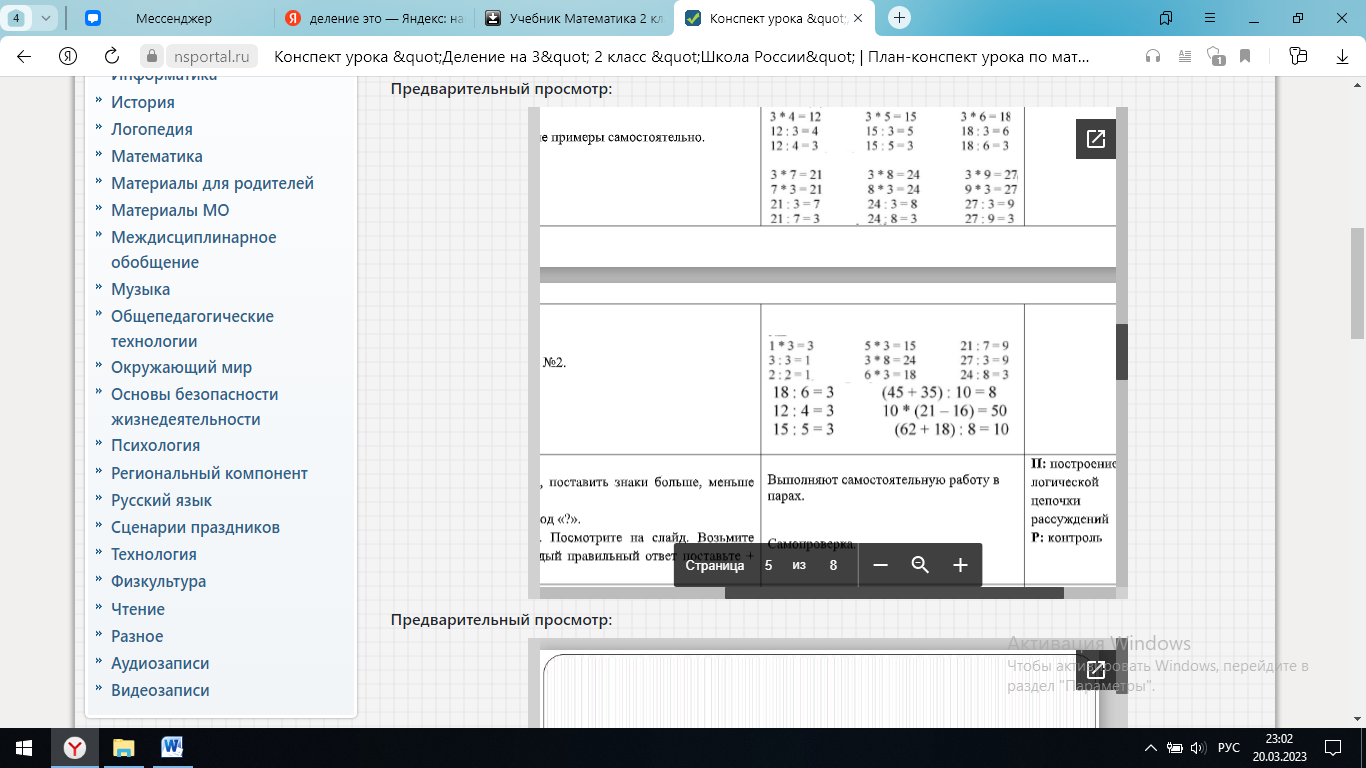 | Подведение итогов | Ребята, что же нового мы сегодня узнали? О каких компонентах деления вспомнили? Обратите внимание на план урока, все ли пункты мы выполнили? - Молодцы, вы хорошо потрудились, мне понравилось, как вы отвечали на вопросы, делали задания, выполняли самостоятельную работу. Спасибо, ребята, за работу, урок окончен. | Правила деления на 3 Делимое, делитель, частное да | Коммуникативные |