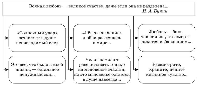 • Можно ли назвать рассказ «Тёмные аллеи» энциклопедией любви? На примере прочитанных рассказов выявите разнообразные оттенки любви, сложную гамму чувств героев.