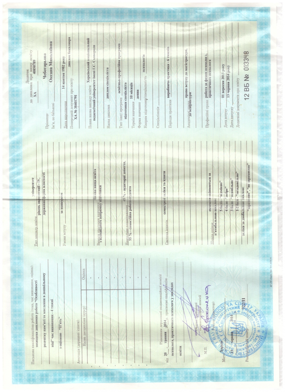 Окончила Харьковский педогогический университет имени Г.С.Скороворды - специальность психолог.