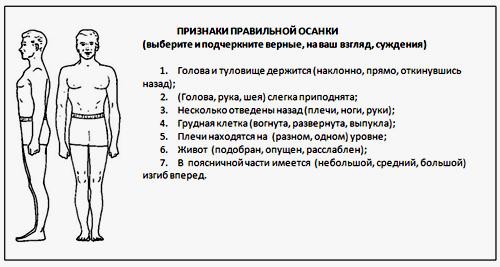 | 4. Изучение нового материала. Физкультминутка. | Формулируем тему и цель урока. «Нарушение осанки» Цель урока: Знать основные признаки нарушения осанки. Уметь определять нарушения осанки. Характеризовать меры профилактики по нарушению осанки. Как вы думаете, что же такое осанка? Запишите определение на 73 странице вашего учебника. А между тем, если верить словарю Даля, слово «осанка» произошло от корня слова «сановник» - «сан». Издавна люди с высоким чином или званием обладали отличной выправкой и менее всего имели проблем с позвоночником – вот почему знатный сан носили по-настоящему статные мужчины. Какая же осанка может считаться правильной? Поднимаемся ребята. При правильной осанке: Голова и туловище держатся прямо. Голова слегка приподнята. Плечи несколько отведены назад. Грудная клетка развернута. Плечи находятся на одном уровне. Живот подобран. В поясничной области имеется небольшой изгиб вперед. Хорошо, присаживайтесь. Различают несколько степеней нарушения осанки. (работа с учебником, стр.73-74). Постоянное нарушение осанки приводит к различным видам искривления позвоночника: лордозу, кифозу, “плоской спине”, “круглой спине” или сколиозу. Для каждого вида нарушения осанки характерно свое положение позвоночника, лопаток, таза и нижних конечностей. Перед вами на партах лежат карточки. Работаем в группах 1)1, 2, 3 и 4 группа определяют, какой вид искривления позвоночника изображён на рисунке, либо определяют болезнь. 2) находят на информационных листах характерные признаки данного вида искривления. 3) предлагают меры профилактики нарушения искривления позвоночника используя информационные листы и материал учебника на странице 74. Беседа. Как вы думаете, у подростков какое самое распространенное нарушение осанки и почему? Чем опасны нарушения осанки и искривления позвоночника? (Нарушением функций органов и систем прямо или опосредовано). Почему правильной осанке особенно уделяют именно в детском и подростковом возрасте? Наклонились, ну-ка, ну-ка! Распрямились, потянулись, А теперь назад прогнулись. Хоть зарядка коротка, Отдохнули мы слегка. Итак, ребята, мы выяснили какие бывают виды искривления позвоночника, узнали, что такое остеохондроз, а теперь попробуем выявить нарушение осанки. Для этого выполним лабораторную работу. Ход лабораторной работы: Поднять правую руку, левая опущена, сцепить руки в замок за спиной, поменять положение рук, повторить. Если это упражнение одинаково легко выполняется с левой и с правой рукой, значит, нет нарушений осанки. Встать спиной к стене так, чтобы пятки, голени, таз и лопатки касались стены. Между стеной и поясницей попробовать просунуть кулак. Если он проходит – нарушение осанки есть, если проходит только ладонь – осанка нормальная. Вывод. Внимание на слайд Ситуация : На день рождения подруги школьница Лида пошла в новых туфлях на высоких каблуках, которые выпросила у мамы. Хотя идти было не близко, и ноги быстро устали, она себя чувствовала совсем взрослой и счастливой. После праздничного стола все пошли танцевать. Но через некоторое время из-за болей в ногах Лиде пришлось отказаться от танцев и провести остаток вечера, сидя на диване в тапочках хозяйки. Как вы считаете, что стало причиной болей в ногах Лиды? Объяснение учителя (использование презентации, слайд “Плоскостопие”). Плос