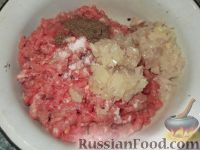 | Соединить фарш и натертый лук. Добавить соль, перец. Перемешать. | |