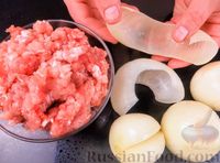 | В каждую луковую заготовку выкладываем по полной столовой ложке начинки. | |