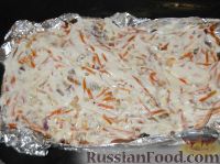 | Сверху выложить морковь с луком. (К обжаренным овощам можно добавить при желании помидоры, фасоль, оливки и т.п.) Равномерно смазать майонезом. | |
