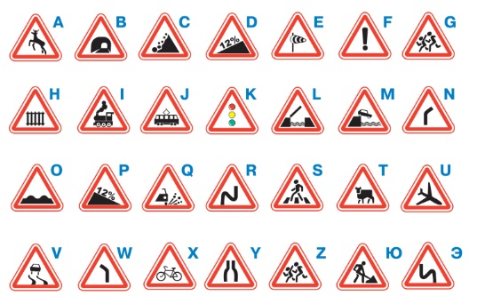 На рисунке изображены предупреждающие дорожные знаки. Эти знаки предупреждают водителя о различных обстоятельствах, которые ожидают его дальше на дороге.